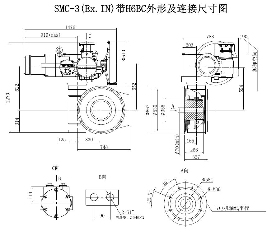 SMC/HBC系列電動裝置是SMC系列多回轉(zhuǎn)電動裝置與HBC蝸輪減速器的組合型式,它適合球閥、蝶閥等部分回轉(zhuǎn)閥門的驅(qū)動控制。SMC/HBC電動裝置具有以下特點:結(jié)構(gòu)設(shè)計堅固可靠,產(chǎn)品規(guī)格齊全,驅(qū)動轉(zhuǎn)矩范圍大且動力輸出穩(wěn)定, 具有良好的自鎖性能。 HBC輸出軸結(jié)構(gòu)獨特,裝有與閥桿連接的漸開線花鍵接頭,產(chǎn)品的安裝調(diào)試方便。