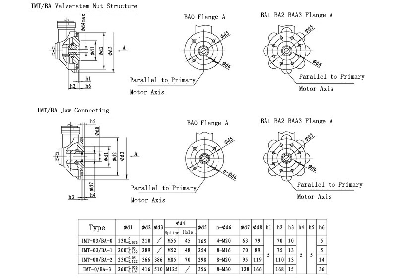 IMT/BA series , the combination of IMT series and BA cone gear reducer, are small and medium size multi-turn valve electric actuators. They are used to drive multi-turn actuators such as gate valves and stop valves. Through the combination of IMT series and BA cone gear reducer, customers can get bigger output torque. On the allowable condition of output speed, this series can improve actuators' generality so that can be used easily.